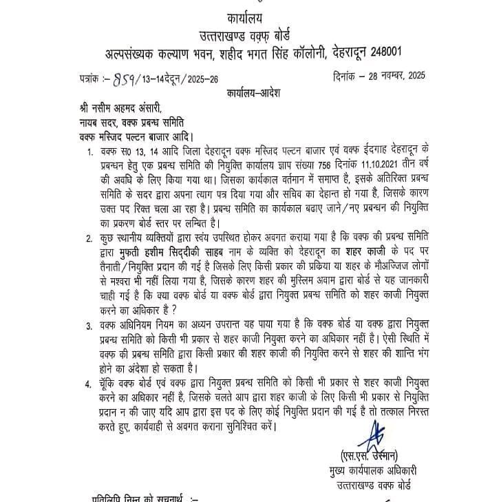 देहरादून मे शहर काजी मौलाना मोहम्मद अहमद कासमी के इंतकाल के बाद नये शहर काजी नियुक्त किये गए मुफ़्ती हसीम कासमी नियुक्ति को लेकर अब विवाद देखने को मिल रहा है। उत्तराखंड वक्फ बोर्ड कि और से जामा मस्जिद कमेटी पलटन बाजार को एक आदेश जारी किया गया है जिसमें कमेटी के द्वारा नियुक्त किए गए शहर काजी मुफ़्ती हसीम कासमी कि नियुक्ति को निरस्त करने के लिए कहा गया है और साथ ही यह भी कहा गया है कि मौजूदा समिति जिसके द्वारा शहर का जी की नियुक्ति की गई है उसका कार्यकाल 2021 में समाप्त हो चुका है इसलिए वह शहर काजी की नियुक्ति नहीं कर सकती है और ना ही उसे समिति को किसी भी तरह की नियुक्ति करने का अधिकार है। साथ ही इस आदेश में यह भी कहा गया है कि शहर काजी की नियुक्ति के लिए किसी भी जिम्मेदार व्यक्ति से कोई भी मशवरा नहीं किया गया है इसलिए शांति व्यवस्था भंग ना हो इसके लिए शहर का जी की नियुक्ति के लिए सभी जिम्मेदार लोगों को मिलकर फैसला लेना होगा।