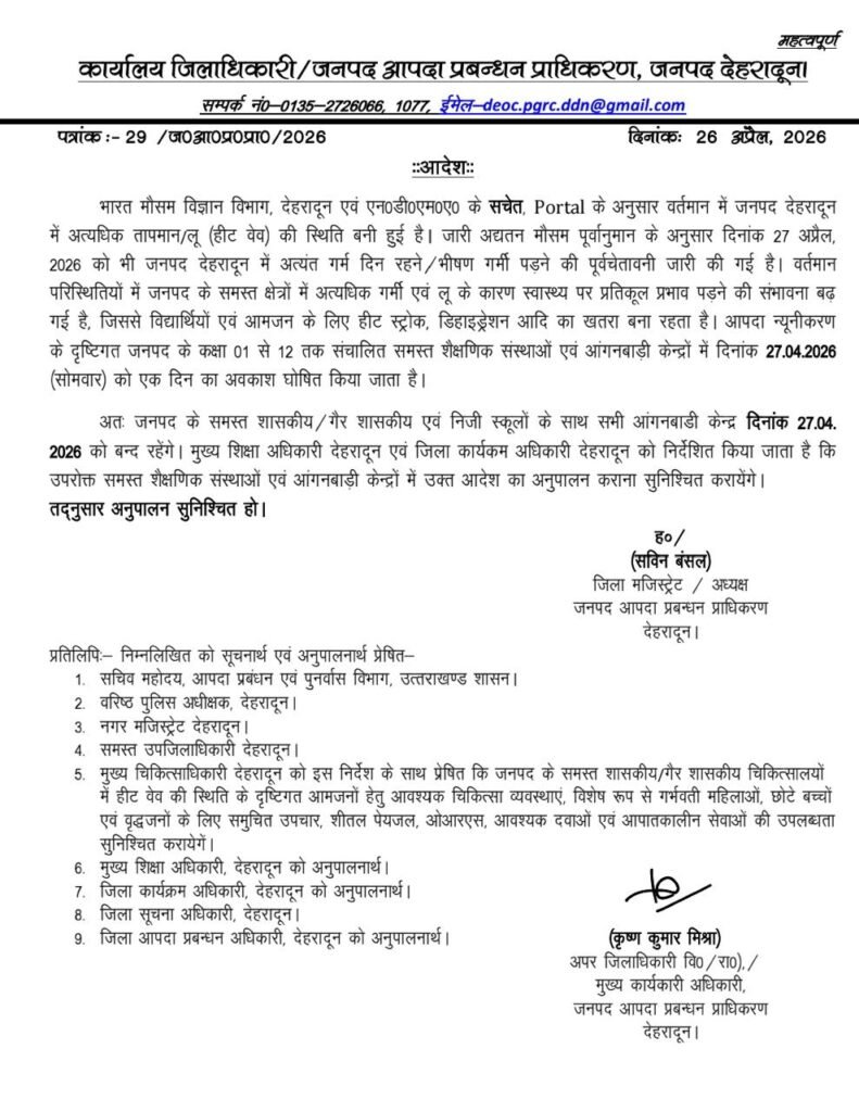 देहरादून: उत्तराखंड की राजधानी देहरादून में सूर्यदेव के कड़े तेवर और बढ़ती तपिश ने आम जनजीवन को प्रभावित करना शुरू कर दिया है। भारतीय मौसम विज्ञान विभाग (IMD) द्वारा जारी ‘हीट वेव’ की चेतावनी और अत्यधिक तापमान को देखते हुए जिला प्रशासन ने बच्चों की सुरक्षा के लिए बड़ा कदम उठाया है।जिलाधिकारी सविन बंसल ने जनपद के सभी शैक्षणिक संस्थानों में कल, 27 अप्रैल 2026 (सोमवार) को एक दिन का अवकाश घोषित किया है।